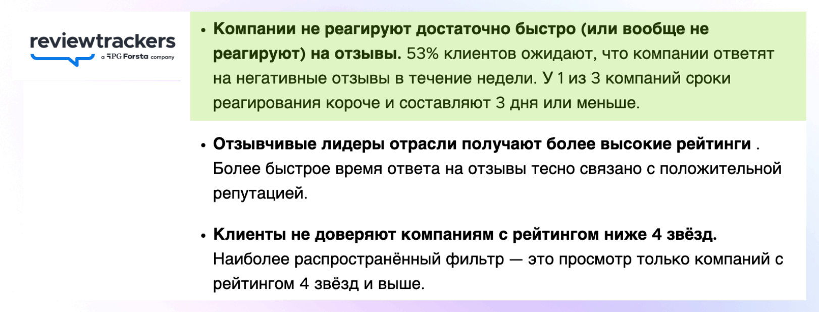 По данным ReviewTrackers, 53% пользователей ждут ответа от бренда даже на положительный отзыв. А исследование BrightLocal показывает: 88% клиентов больше доверяют компаниям, которые отвечают и на хорошие, и на плохие комментарии. Потому что такой бизнес кажется живым, вовлеченным и благодарным, а не тем, кто включается только в кризис.