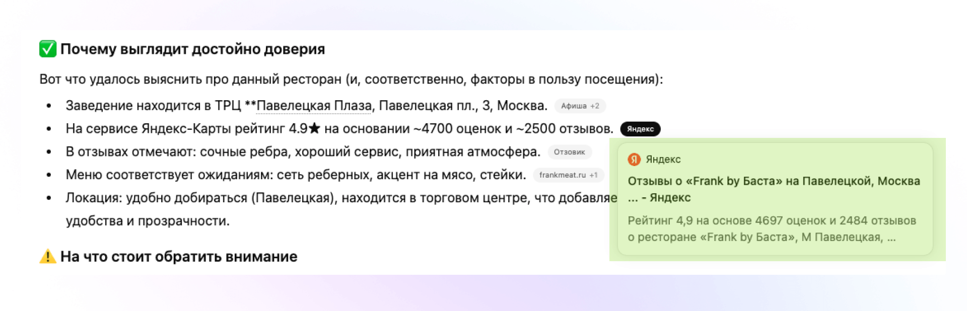 7. Искусственный интеллект.Сегодня Алиса, ChatGPT и другие умные помощники становятся настоящими рекомендателями. Они советуют, куда идти и каким брендам доверять. А источником для этих рекомендаций служат именно поисковая выдача и базы с отзывами. Поэтому работа с репутацией уже выходит за рамки маркетинга — она становится частью экосистемы искусственного интеллекта и GEO-продвижения.