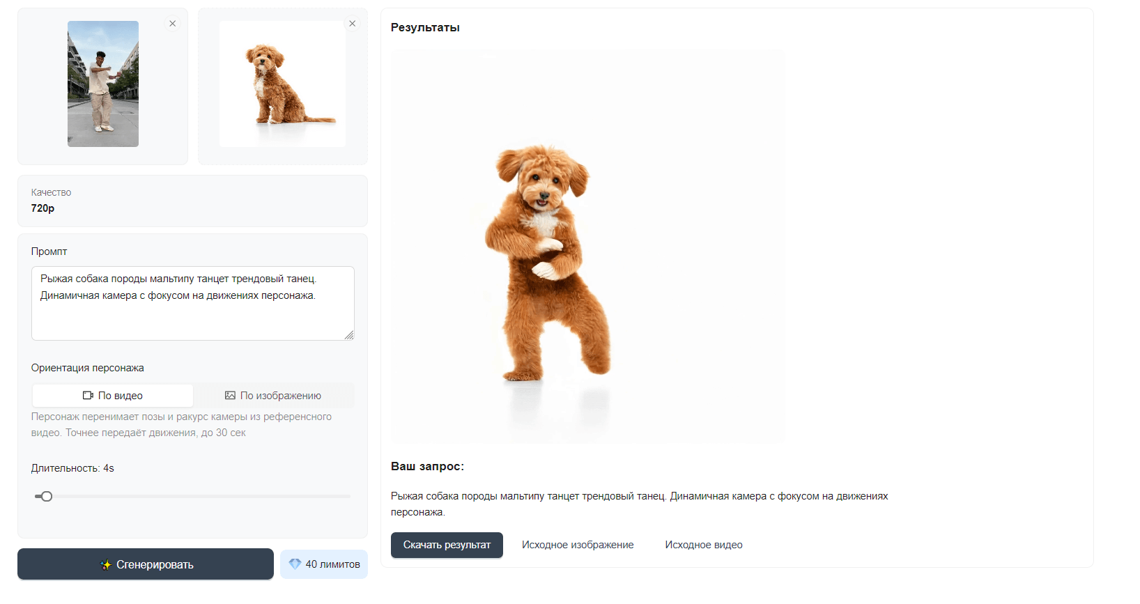От ориентации персонажа зависит, как Motion Control будет совмещать карту движения из видео с анатомией объекта на фотографии. В нашем примере собака должна повторять движения человека в танце, и это может вызвать определенные трудности.