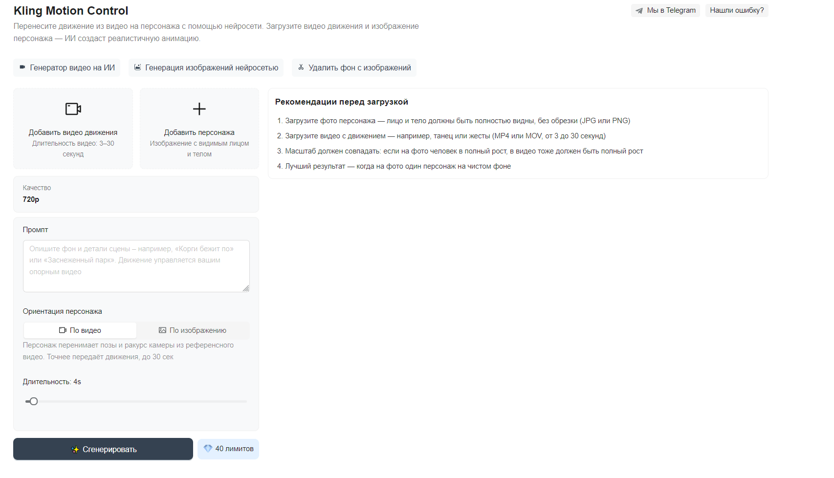 В таком случае можно воспользоваться альтернативой — инструментом для генерации видео на базе Motion Control. Его можно оплатить российской картой, поэтому он подойдет тем, кто хочет работать с ИИ без лишних сложностей и обходных решений.