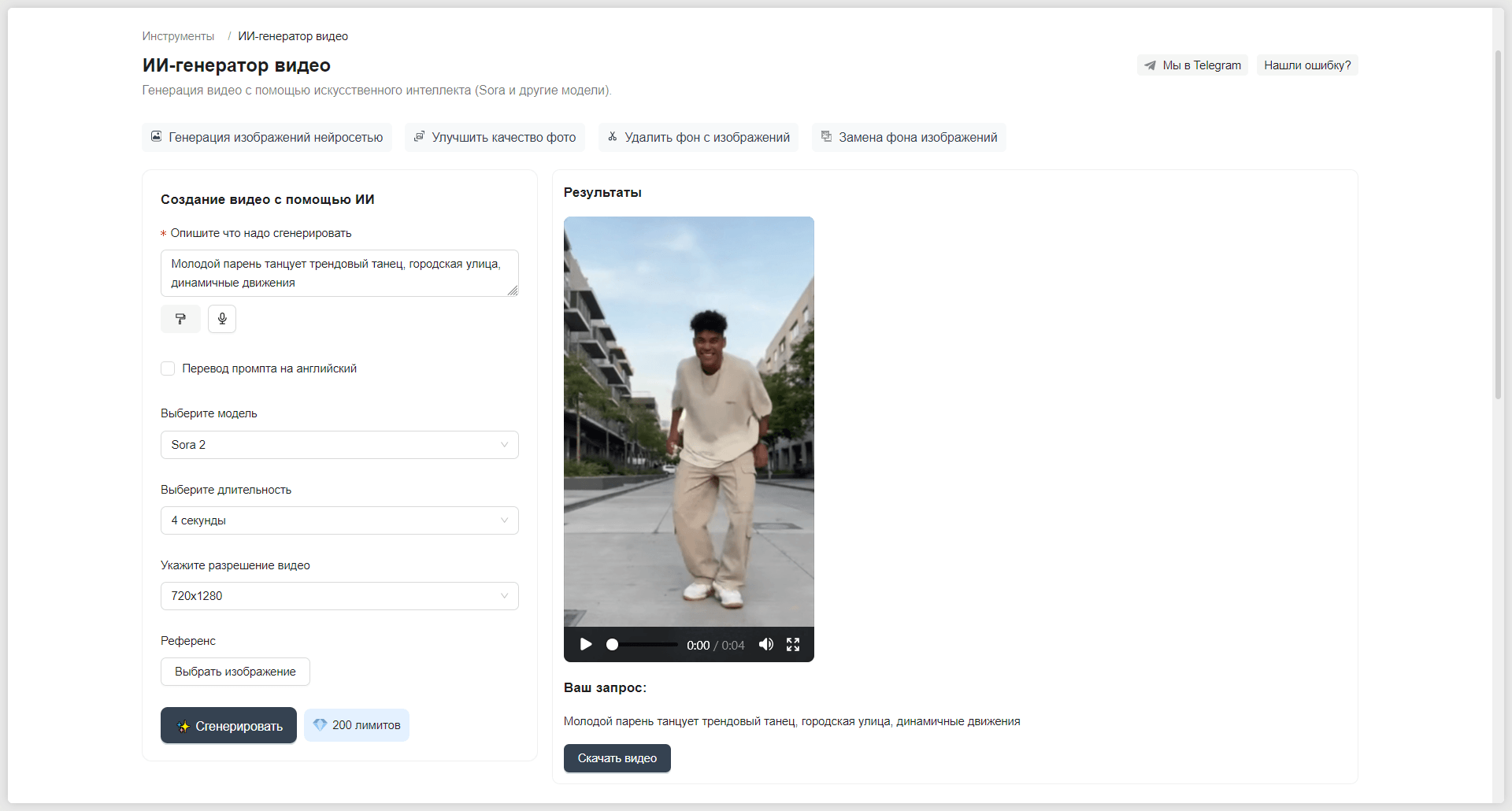 Подготовим исходник с помощью простого промпта. Нам нужен ролик с динамичным танцем на естественном фоне — именно это и укажем в инструкции, а также зададим нужные параметры видео, включая длительность и разрешение.