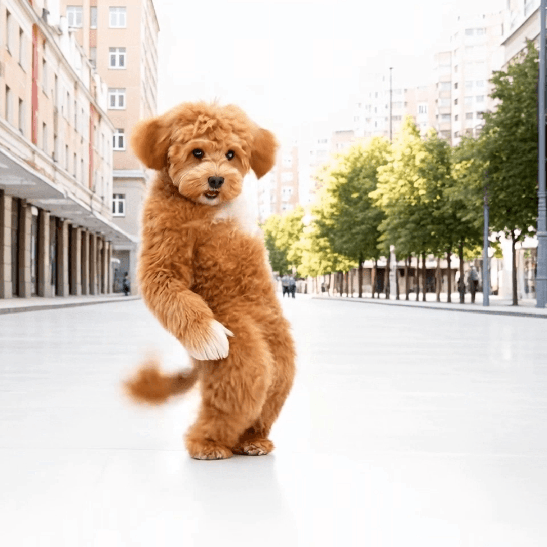 Давайте слегка доработаем промпт и добавим в него несколько деталей из исходного видео: пусть собака танцует на городской улице, а на заднем плане будут деревья и дома.