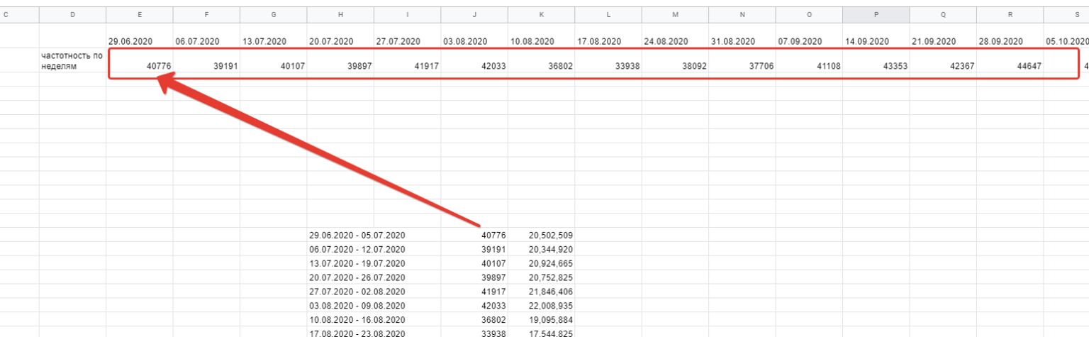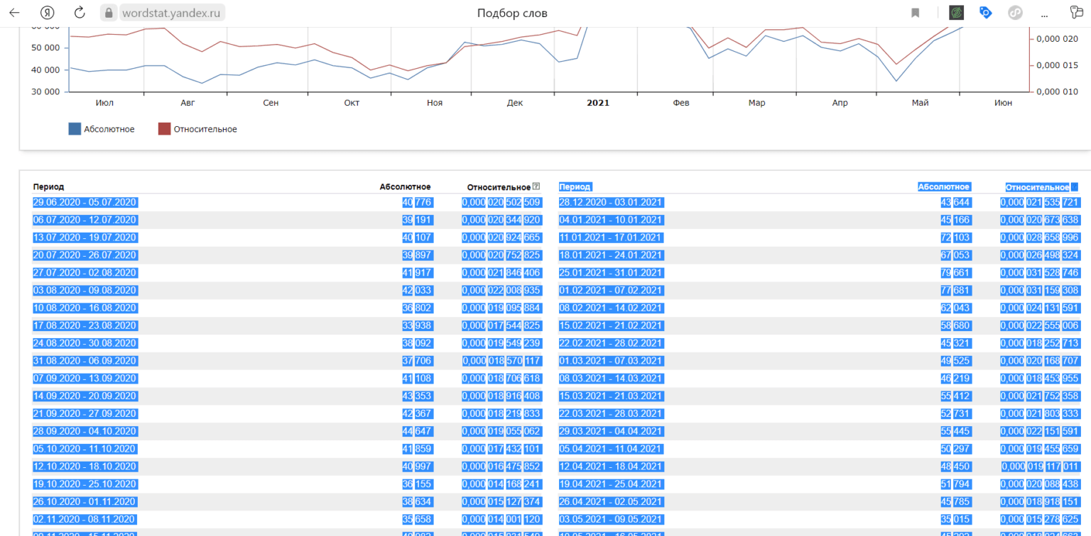 Открываем Вордстат и скачиваем динамику запросов по неделям в Гугл таблицу. Раньше для этого нужно было выделить весь диапазон и скопировать, сейчас – просто скачать готовый документ.