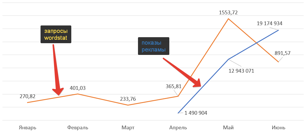 На выходе в зависимости от вида отображения получаем таблицу или диаграмму , которая показывает влияние рекламы на количество запросов.