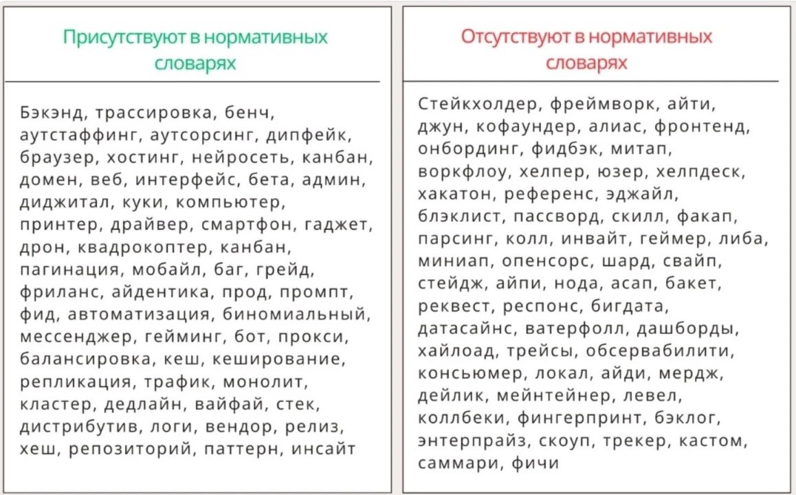 В нормативных словарях присутствуют ИТ-термины: бэкэнд, трассировка, бенч, аутстаффинг, аутсорсинг, дипфейк, браузер, хостинг, нейросеть, канбан, домен, веб, интерфейс, бета, админ, диджитал, куки. Само собой, есть компьютер, принтер, драйвер, смартфон, гаджет. Даже дрон и квадрокоптер.