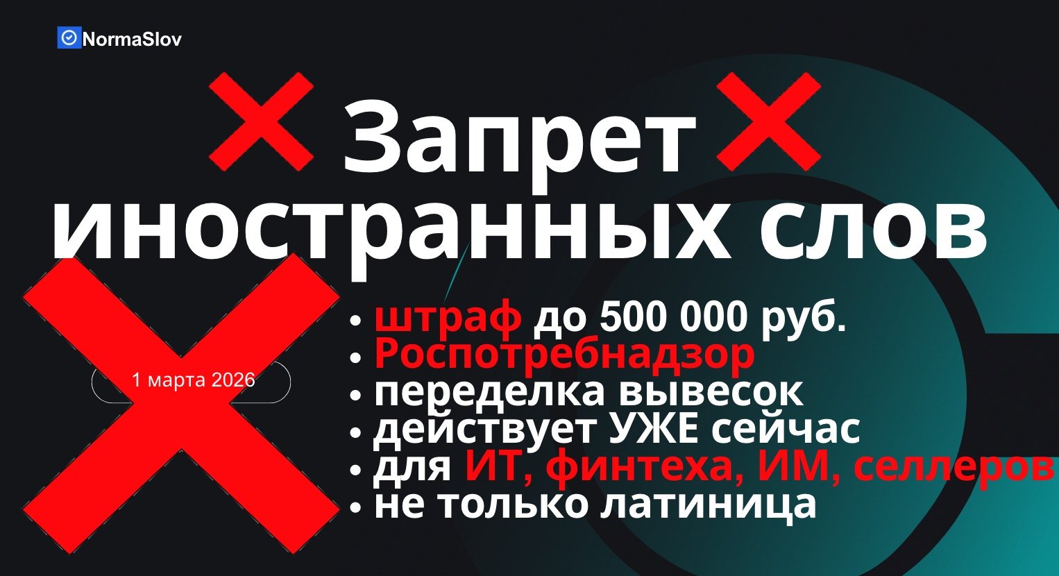 Штраф до 500 000 рублей за каждое иностранное слово: «онбординг», «IT», «digital», «асап», «краш« «кринж»? С 1 марта 2026 иностранные слова запрещены в публичном поле — вывесках, указателях, табличках. Но уже действуют 53-ФЗ и 38-ФЗ, которые НЕ разрешают использовать иностранные слова в рекламе, инфо для потребителя и СМИ. Как теперь писать кейсы, запускать контекст и делать посевы, но не нарваться на ФАС и Роспотребнадзор — инструкции NormaSlov.