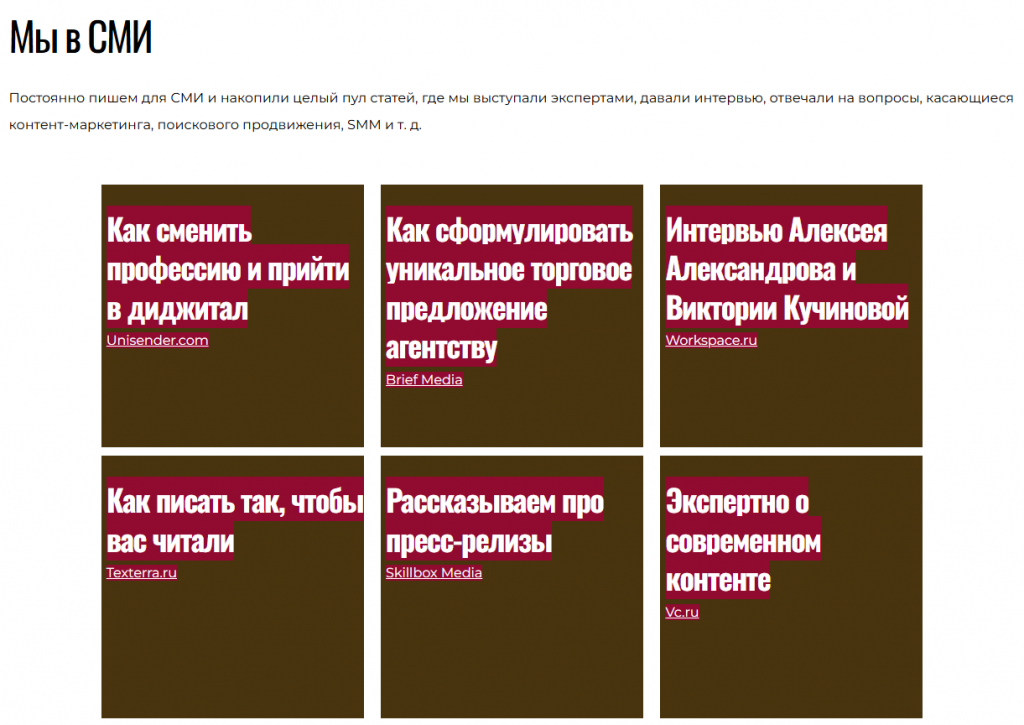 Мы как контент-агентство обеспечиваем копирайтинг — качественные статьи, которые принимают ведущие СМИ.