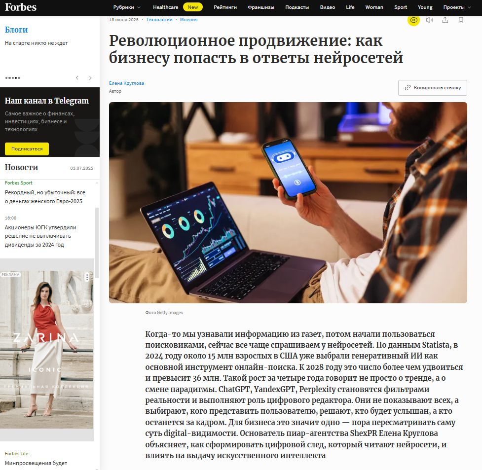 Это Forbes, Ведомости, РБК, Российская газета, Hello, Ok! и т. п. Над публикациями в этих изданиях мы работаем совместно с пиарщиком Еленой Кругловой.