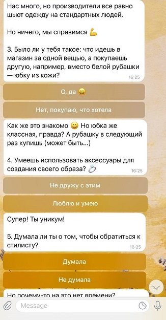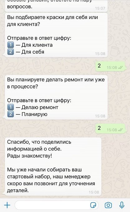 Например, если ваш товар могут приобрести не только для личного пользования, но и для своих клиентов, то стоит включить в чат-бот вопрос — кому присматривают продукцию. Так мы поступили для клиента, который занимался поставкой красок.