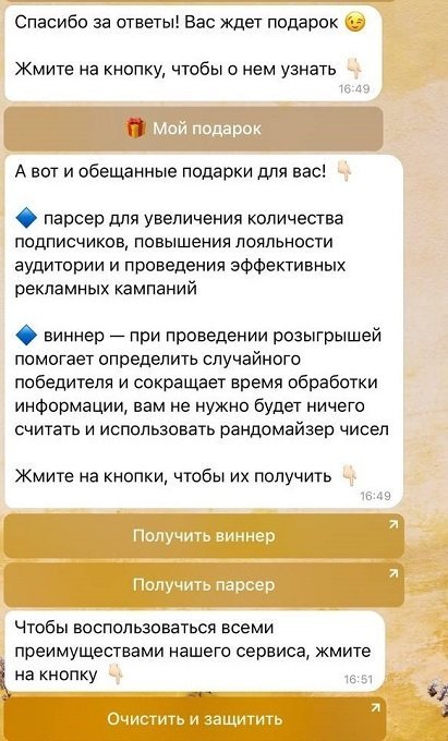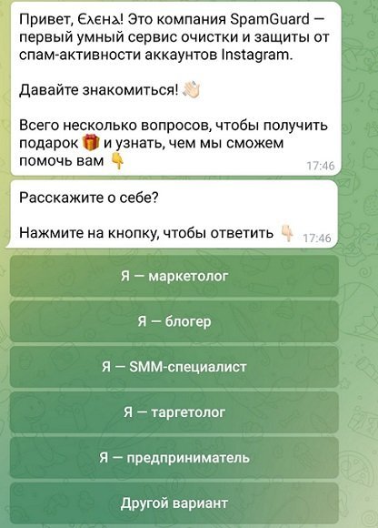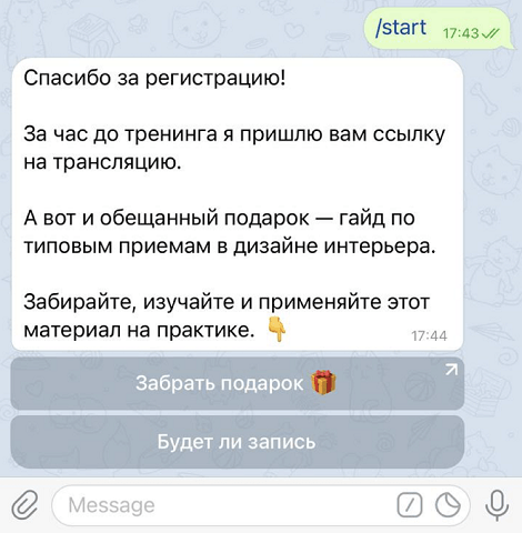 Если вы обещали полезный материал за подписку, то чат-бот приветствует пользователя и выдаёт этот материал после небольшого опроса или сразу.