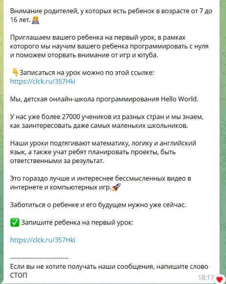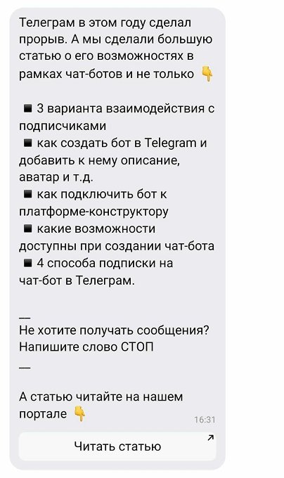 Мы отправляем небольшие сообщения, потому что их легче воспринимать. Лучше всего, когда текст помещается максимум на один экран телефона, чтобы подписчикам было удобно читать.