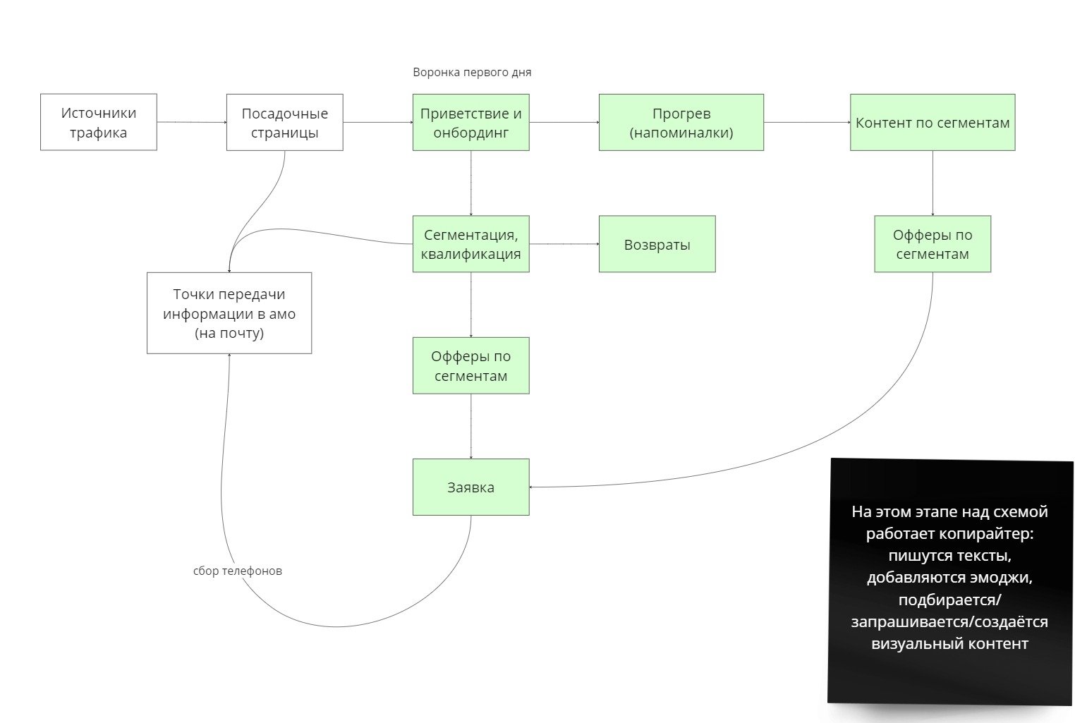 Перед разработкой текстов мы создаём сценарий мессенджер-воронки. Потому что, в отличие от постов в соцсетях, каждое сообщение в мессенджерах должно логически выходить из предыдущего и вести к единой цели: покупке курса, оплате товара или услуги и т.д.