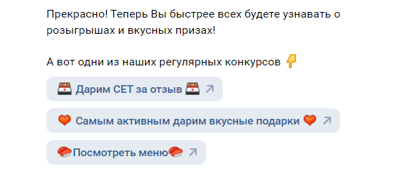 Обычно мы не просто выдаём контент, но и стимулируем активность аудитории, «беседуем» с людьми с помощью чат-бота. Отвечаем на каждое сообщение пользователя, отправляем ему реакцию на действия, как делали бы сами в обычной жизни.