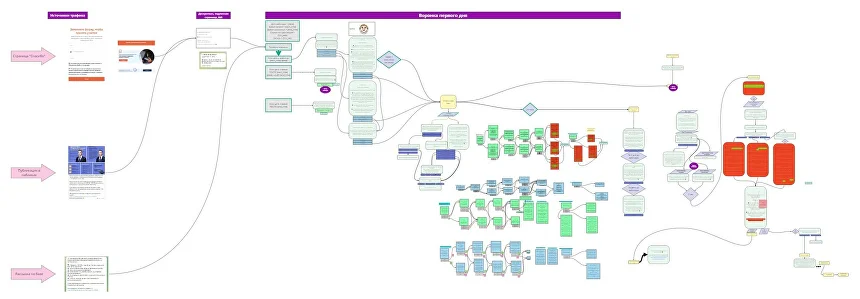 После того, как мы определяемся с источниками трафика, целями и сегментами, мы создаем схему чат-бота, чтобы понять, как поэтапно будет выстроен диалог.