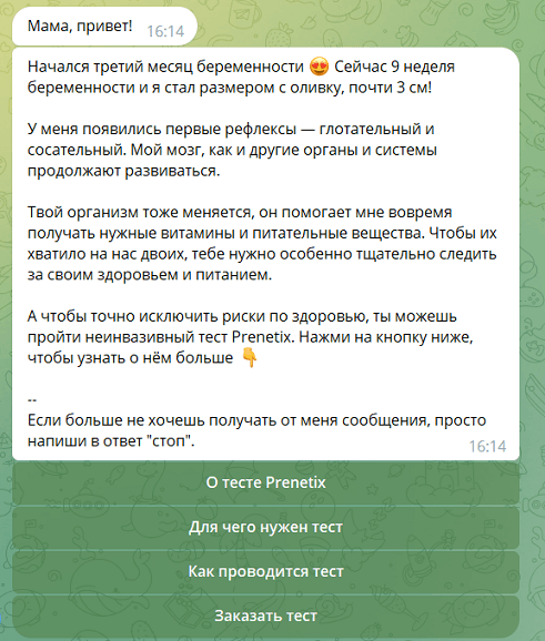 А для проекта, где целевой аудиторией были беременные женщины, мы создали чат-бот, в котором сообщения приходили от имени будущего ребенка. Здесь особенно было важно соблюдать тактичность и писать тексты так, чтобы не напугать, но дать повод задуматься о здоровье малыша.