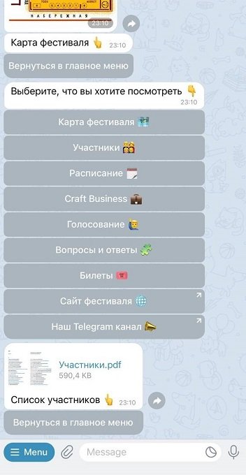Или другой пример из нашей практики — нам нужно было создать чат-бот-приложение для участников фестиваля. Главной задачей было дать пользователям информацию о мероприятии и настроить возможность голосования в двух номинациях.