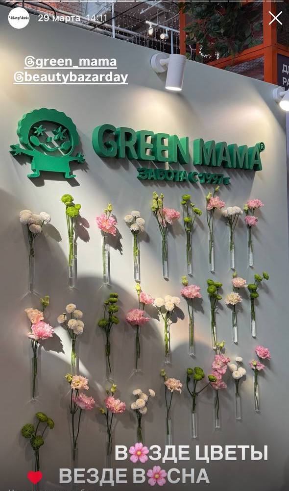 Пример: мы разработали концепцию, в рамках которой корнер Green Mama вдохновлен природными мотивами, отсылающими к натуральности продукции, и весной: к стенду прикреплены колбы, в которых стоят живые цветы в оттенках, которые можно найти в упаковке продуктов Green Mama — так мы создаем визуальные ассоциации с брендом.