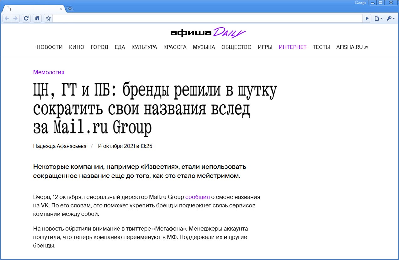 Яркий пример, когда многие компании стали в шутку сокращать свои названия после ребрендинга банка «Тинькофф» в Т-Банк и Mail.ru Group в VK.