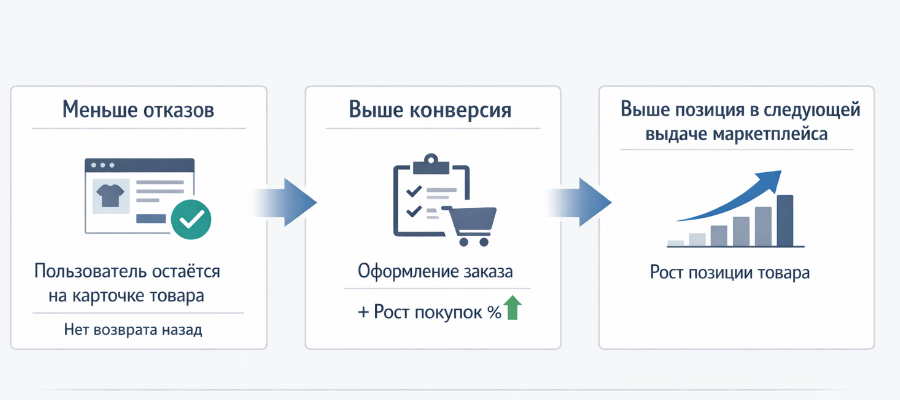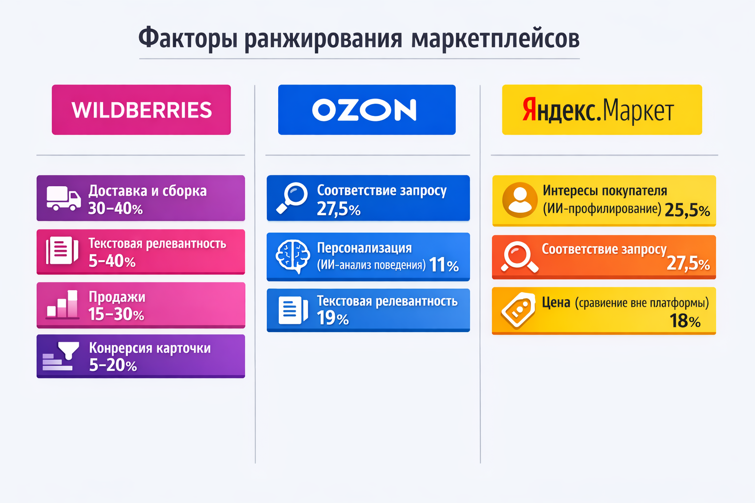 В России доля маркетплейсов в e-commerce превысила 60%. Это не Запад, где бренды борются с ChatGPT Shopping за прямой трафик на свои сайты. У нас 90% всех розничных покупок идет Wildberries, Ozon, Яндекс.Маркет. И эти платформы уже используют искусственный интеллект для ранжирования товаров. Алгоритмы смотрят не только на цену или отзывы, но и на десятки других критериев.