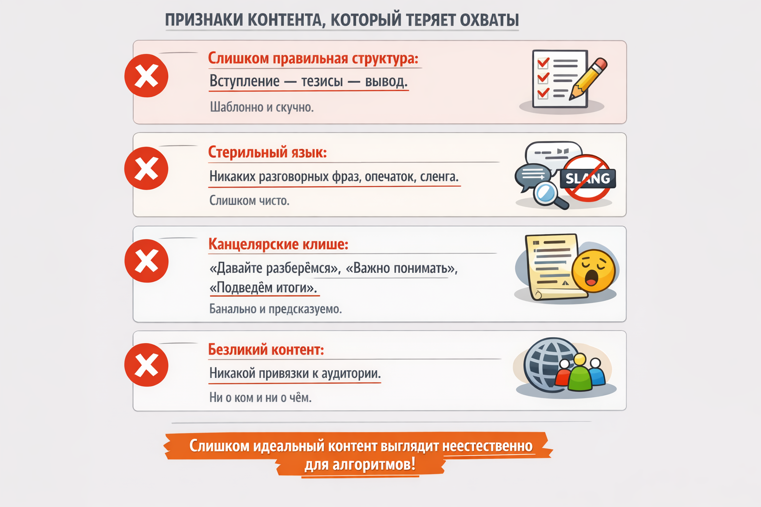 Детекторы ИИ-контента (включая алгоритм ВК) анализируют предсказуемость. Если речь слишком гладкая, без «эээ», без потери мысли, без изменения интонации, это подозрительно.