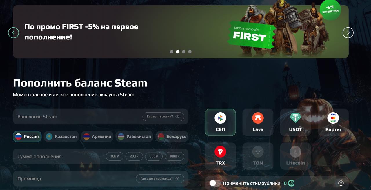 Steam.ru — это специализированный сервис, созданный для пополнения баланса Steam игрокам из России. Его цель не только вернуть возможность комфортного пополнения, но и модернизировать этот процесс, сделав его еще более удобным, чем это было до 2022 года. И стоит признать, что у них это получилось.