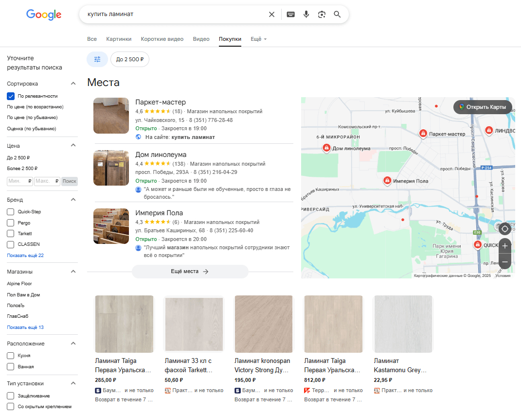 Вкладка «Покупки» в Google показывает товарные позиции с разных сайтов