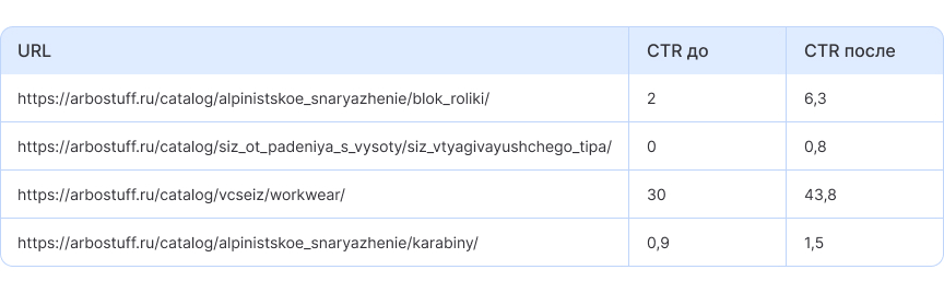 Пример из практики — интернет-магазин снаряжения для альпинизма. После корректировки заголовков, добавления релевантных ключевых слов, цен и рейтингов, сниппеты стали заметнее. В результате средний CTR увеличился в 2–3 раза, а объем продаж вырос вдвое.