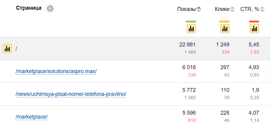CTR страниц из Топ-10 выдачи в интерфейсе Яндекс.Вебмастер