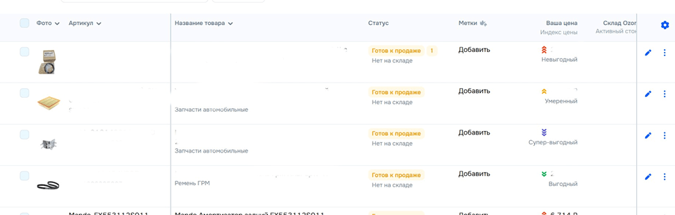 Автоматическая загрузка в личный кабинет. После обработки система формирует готовые карточки и через API отправляет запросы на добавление или обновление товаров в кабинете продавца. Новые карточки появляются на Ozon уже с обновлёнными описаниями и чистыми изображениями.