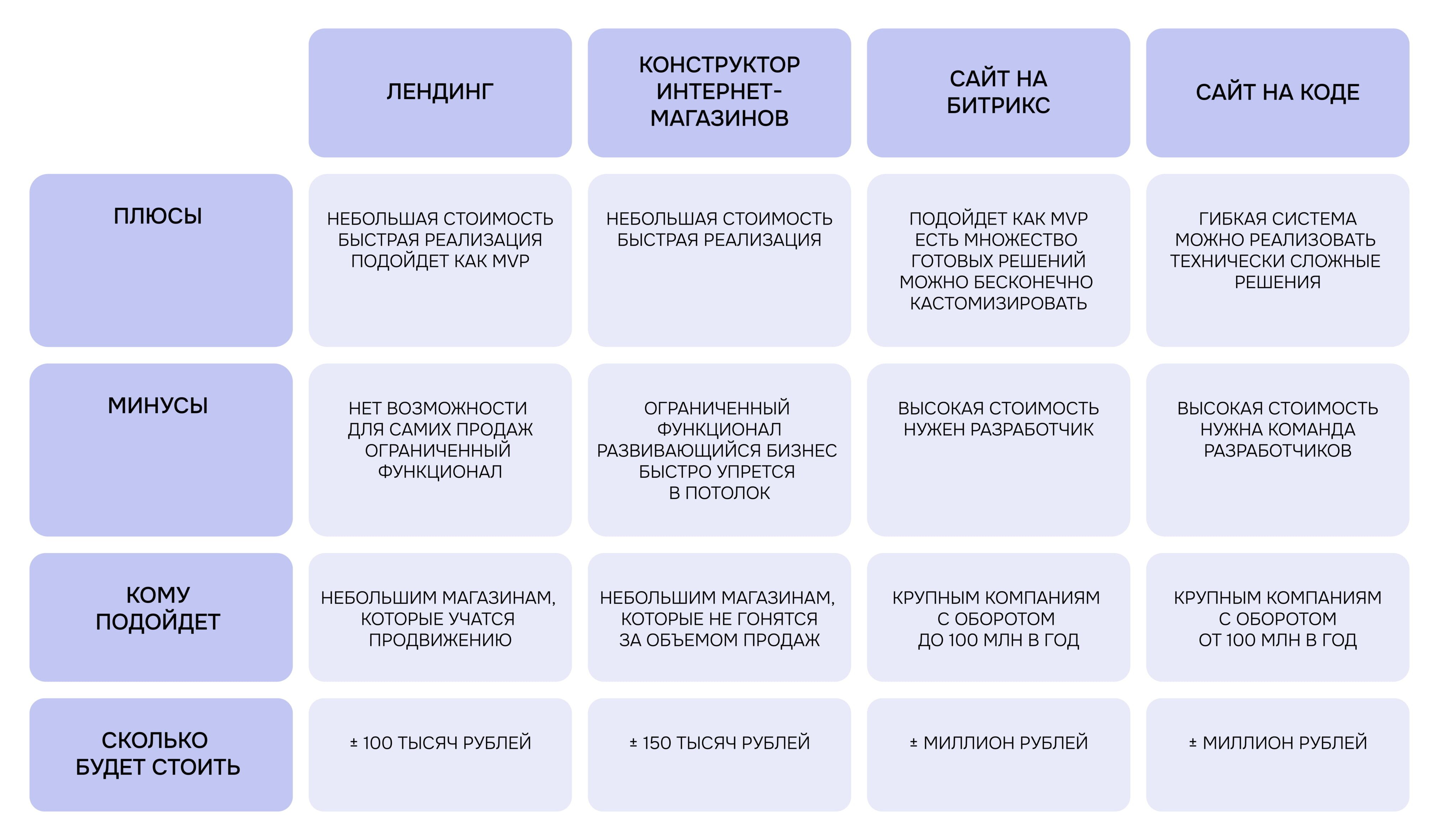 Когда будете выбирать вариант для запуска интернет-магазина, можете подглядывать в нашу таблицу.