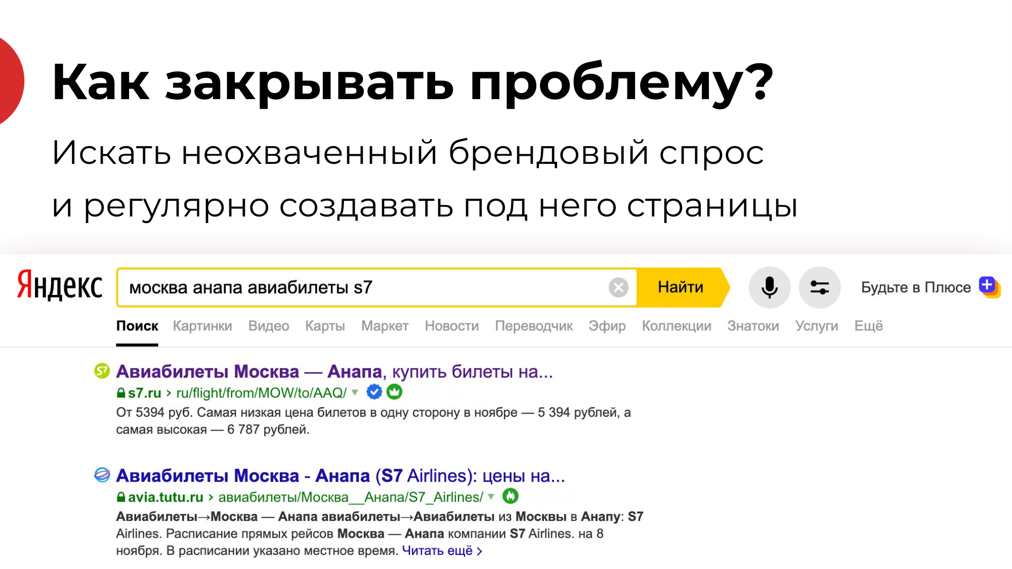 Люди ищут ваш бренд разными запросами. По их формулировкам можно доработать сайт, чтобы вести на него нужную аудиторию бесплатно. Вот пример страницы для полёта Москва — Анапа. Она появилась, потому что людям была нужна такая информация. И эта страница первая в выдаче при релевантном запросе: