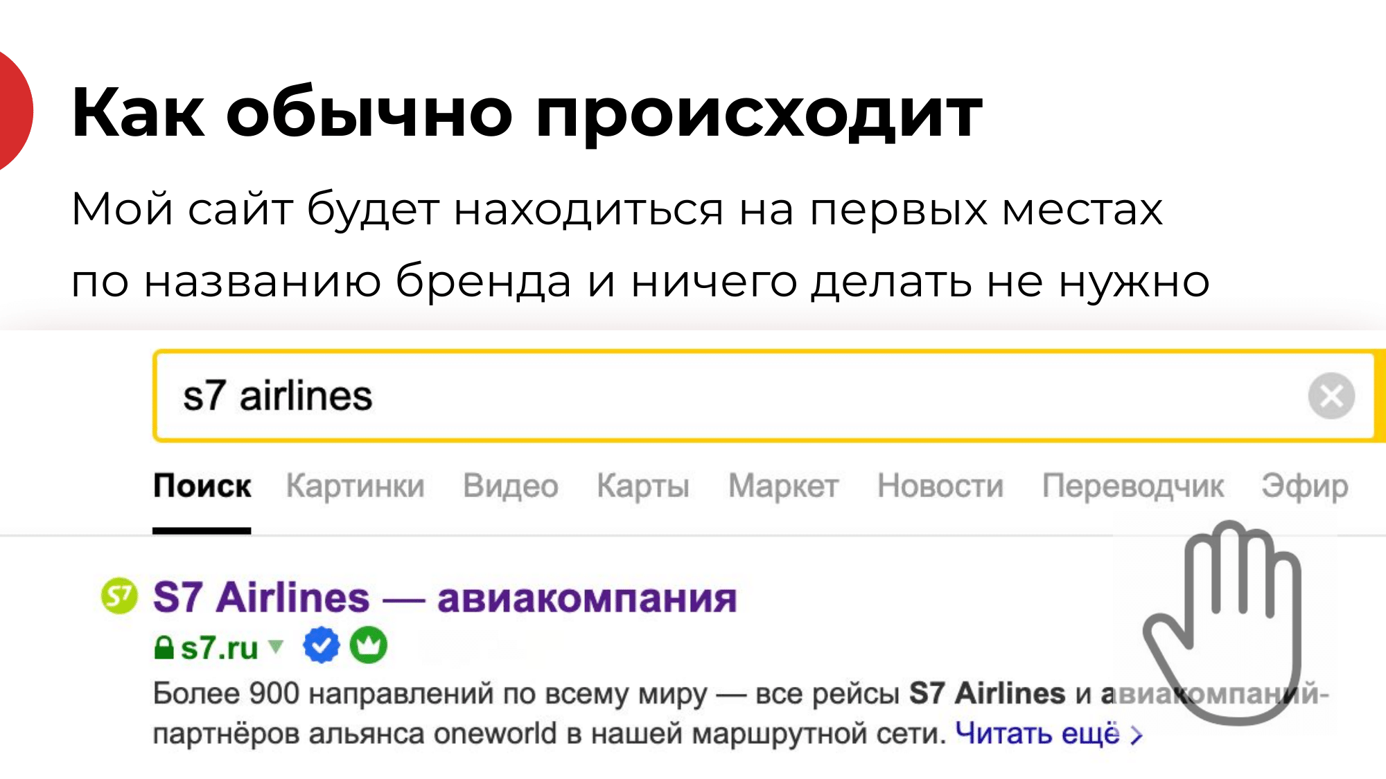 Обычно ситуация выглядит следующим образом: кажется, что сайт по брендовому спросу всегда будет находиться на первых местах в поиске. Вот пример брендового запроса авиакомпании S7: