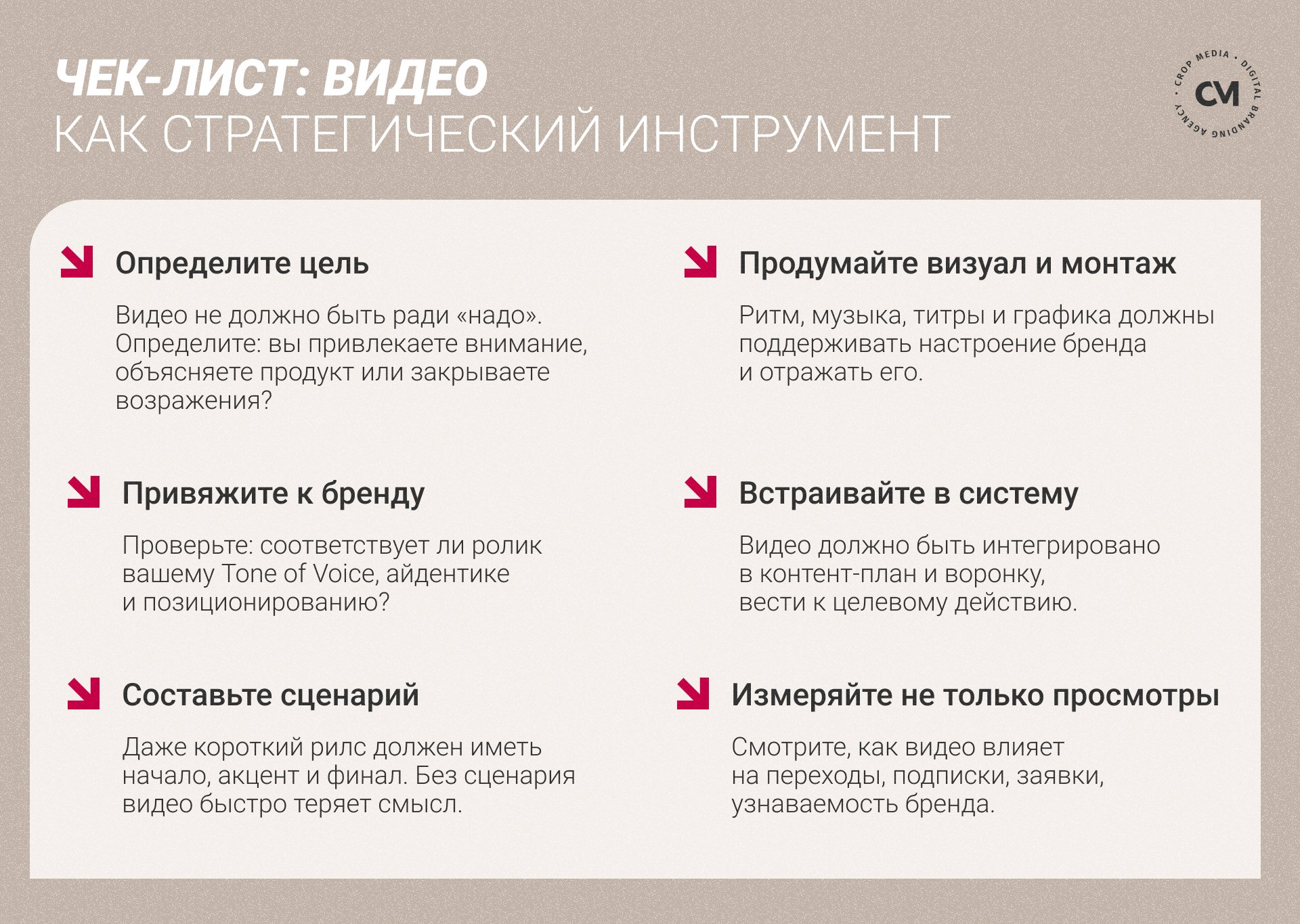 Чтобы ролик усиливал бренд, он должен звучать и выглядеть как продолжение всей коммуникации компании, а не как отдельный элемент.