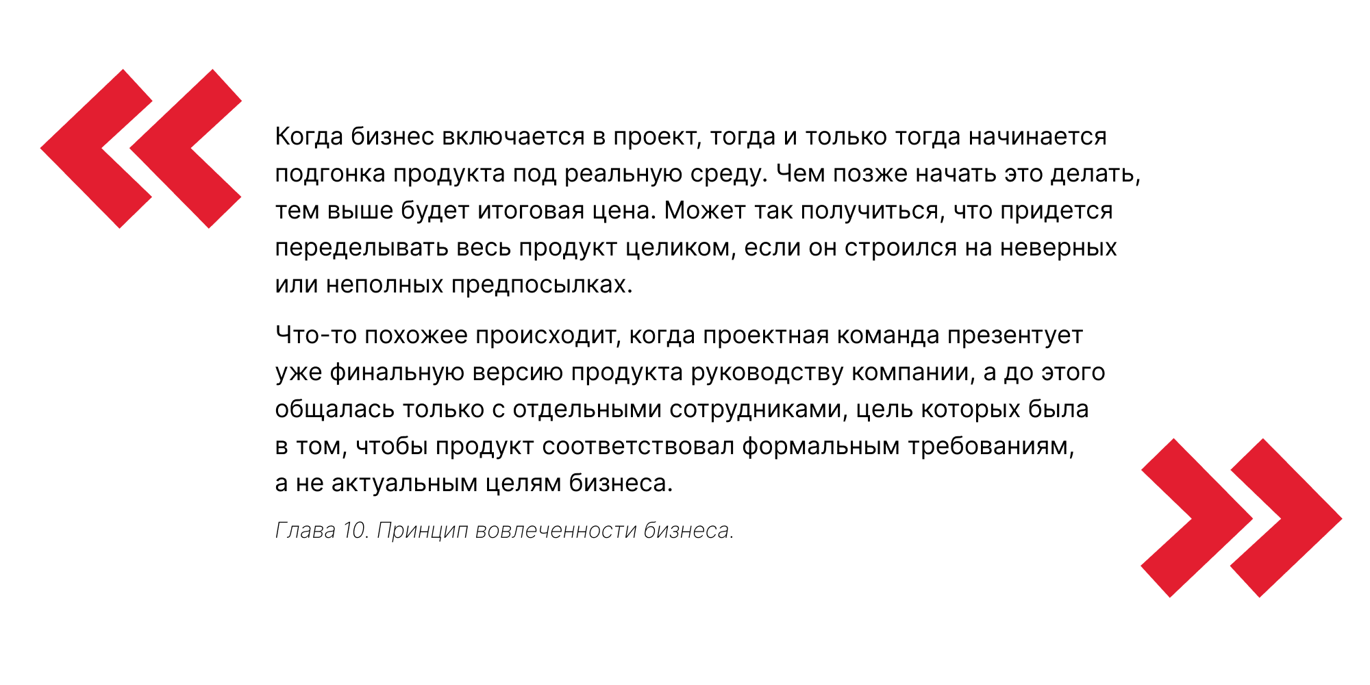 У меня в книге это описывается как некий принцип вовлеченности бизнеса, чтобы бизнес не был таким воскресным папой, который сначала участвовал в создании ребенка, а потом на выпускном приходит и говорит: «Ну, показывайте продукт». Камон, чувак, ну как бы ты должен был участвовать вообще на всех стадиях: в детский сад его отвезти, в школу, потому что в эти моменты ты мог увидеть и скорректировать. А сейчас поздно уже говорить, что не это заказывал.