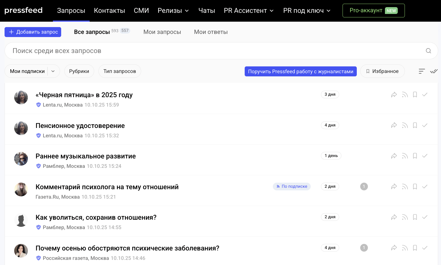 Можно вручную писать в редакции и предлагать себя в качестве спикера, но успеха обычно в этом процессе не очень много. Можно пойти другим путем: перестать бегать за журналистами и пойти им навстречу. Редакторы и журналисты постоянно ищут героев и экспертов для статей, а запросы размещают на Pressfeed. Каждый день появляются десятки вопросов — от “Что будет с курсом доллара” до “Как фазы луны влияют на сон”.