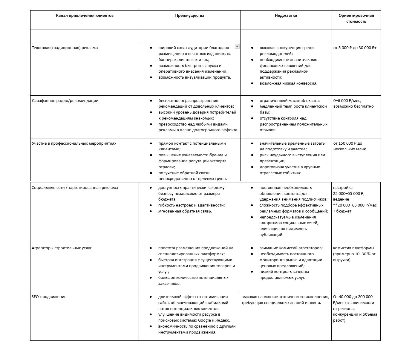 Для наглядного понимания преимуществ и недостатков актуальных каналов для привлечения клиентов рекомендуем ознакомиться со следующей таблицей: