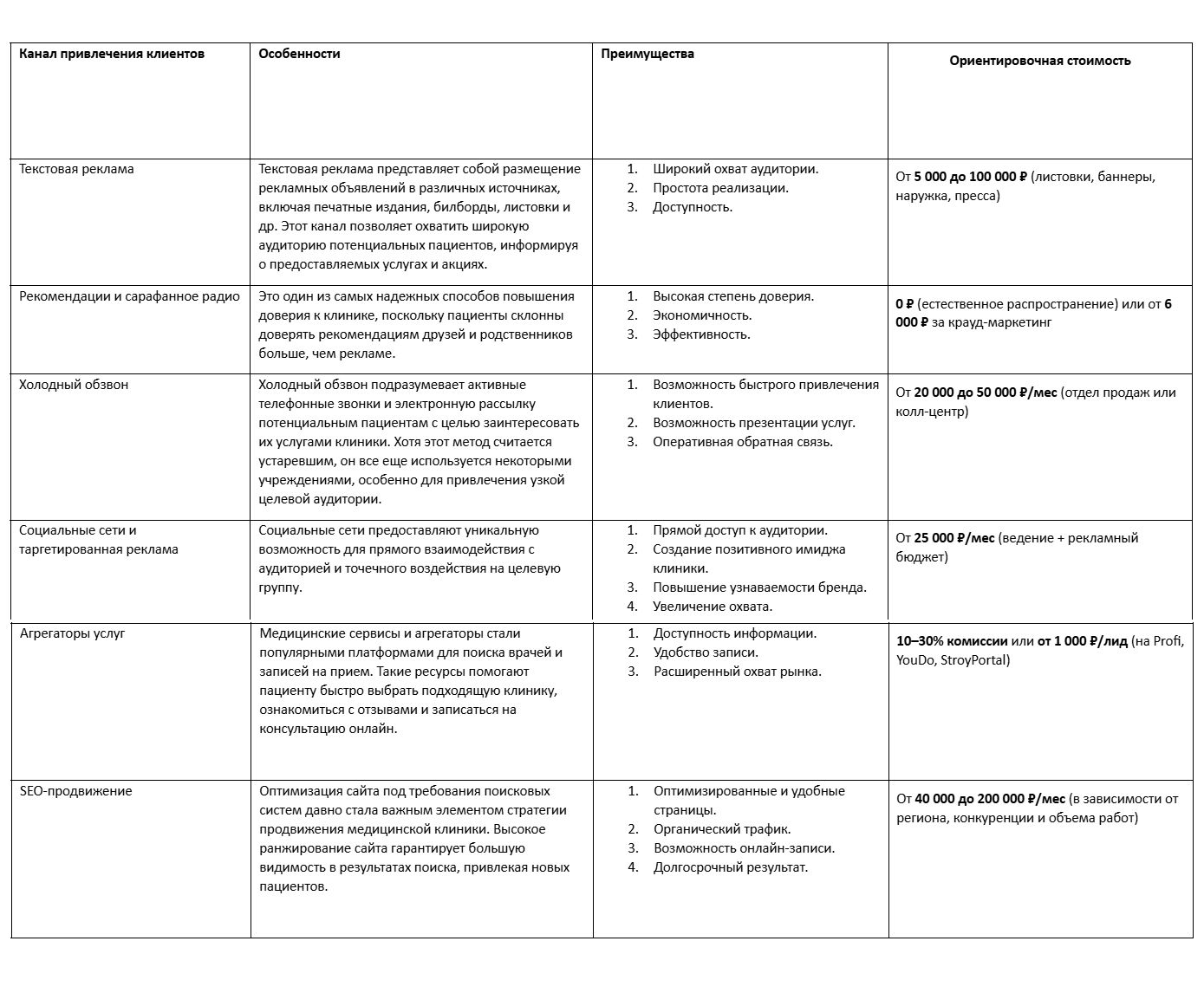 Однако разработка успешной стратегии по привлечению клиентов для медицинских клиник требует комплексного подхода, учитывающего особенности целевой аудитории, специфику предоставляемых услуг и конкурентную среду региона.