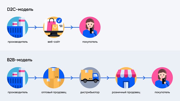 В традиционных моделях B2C и B2B производитель передаёт товар розничным сетям, дистрибьюторам или маркетплейсам, которые берут на себя логистику, продвижение и обслуживание клиентов. В D2C же компания должна самостоятельно выстроить процессы:
