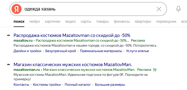 Показывается пользователям на основе их поисковых запросов. Например, человек вводит в поисковой строке «купить велосипед» и в результатах поиска видит рекламное объявление магазина, который продает велосипеды. Такие объявления выглядят как обычные ссылки с пометкой «Реклама» и помогают находить клиентов, которые уже заинтересованы в товаре или услуге. Размещается в поисковых системах Яндекс и Google.