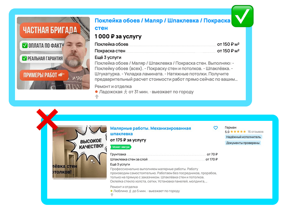 Обложка объявления — первое, что видит пользователь. Она должна мгновенно показывать суть услуги, выделяться среди конкурентов и вызывать доверие.