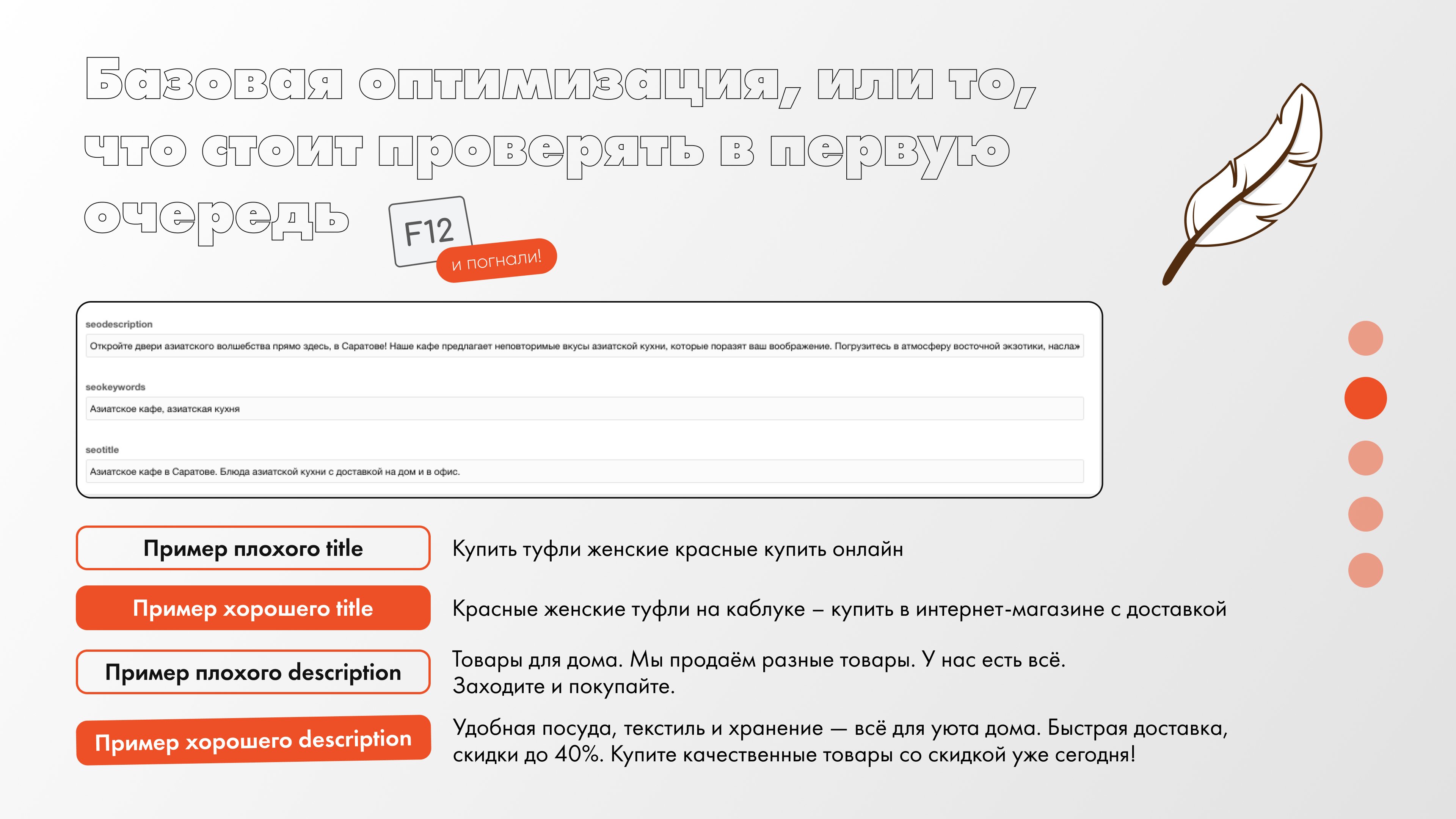 Всё должно быть в зеленой зоне. Также прогоняйте сайт через все доступные валидаторы:
