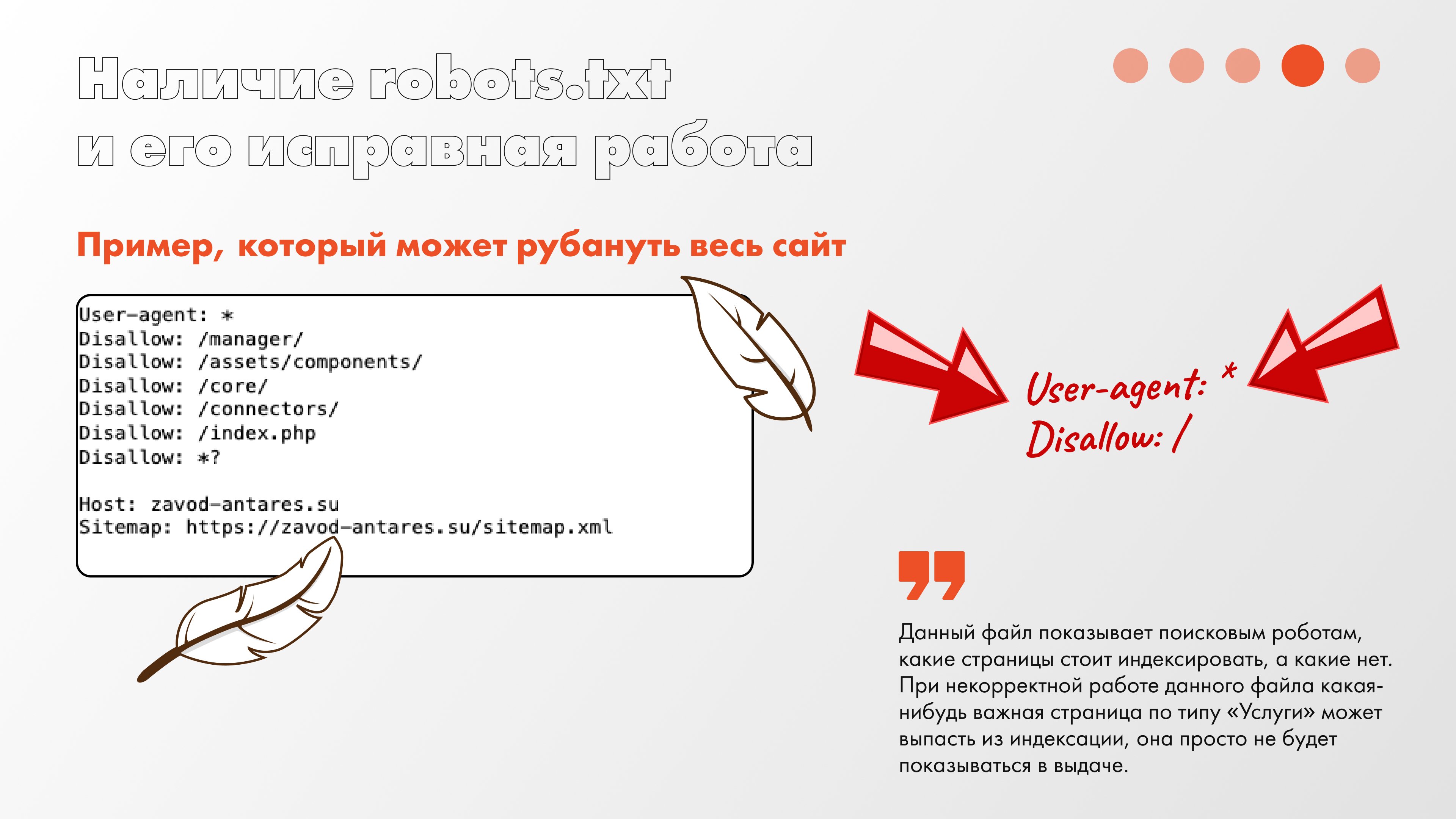 Наличие robots.txt и его исправная работа. Данный файл показывает поисковым роботам, какие страницы стоит индексировать, а какие нет. При некорректной работе данного файла вам просто могут обрубить концы, и какая-нибудь важная страница по типу «Услуги» просто может выпасть из индексации, она просто не будет показываться в выдаче. Но помните, что можно блокнуть и весь сайт.