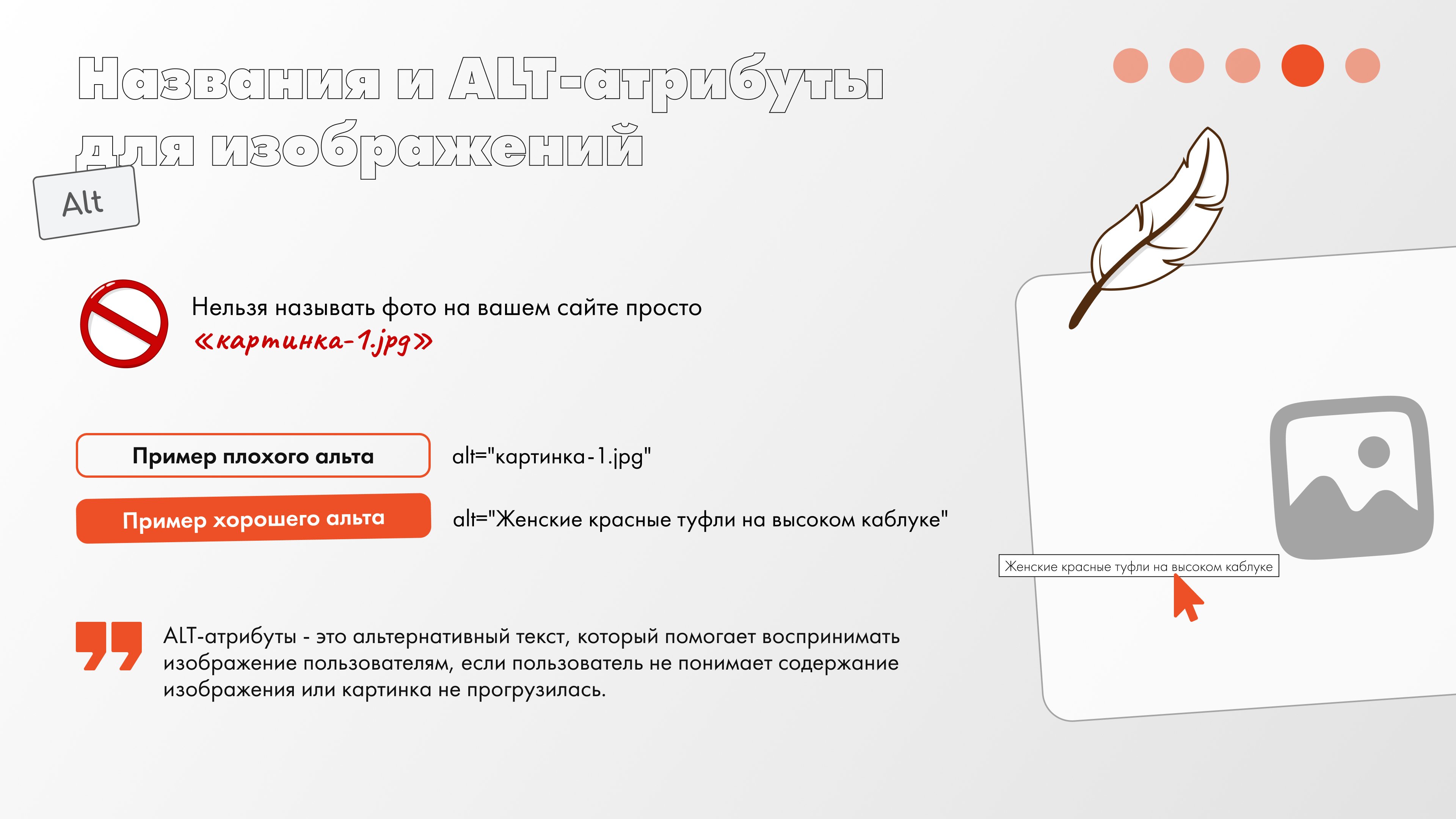 Что касается ALT-атрибутов, то это альтернативный текст, который помогает воспринимать изображение пользователям, если: пользователь не понимает содержание изображения или картинка не прогрузилась. Ну и не забываем, что по альтам поисковики тоже понимают, что происходит на странице в целом.