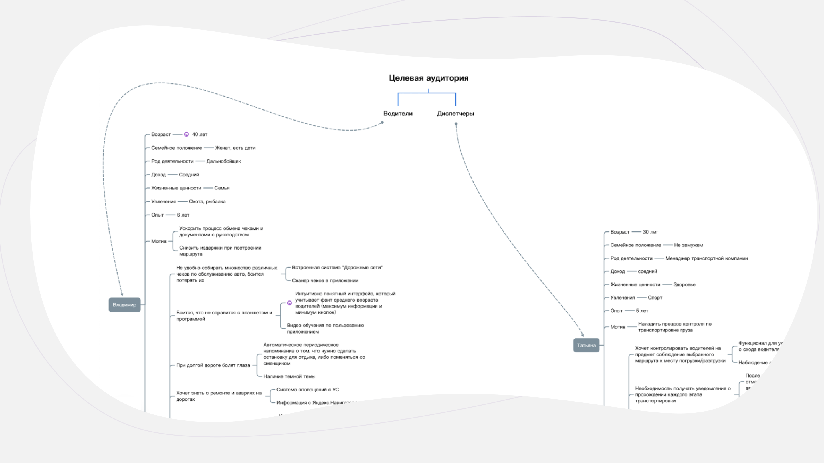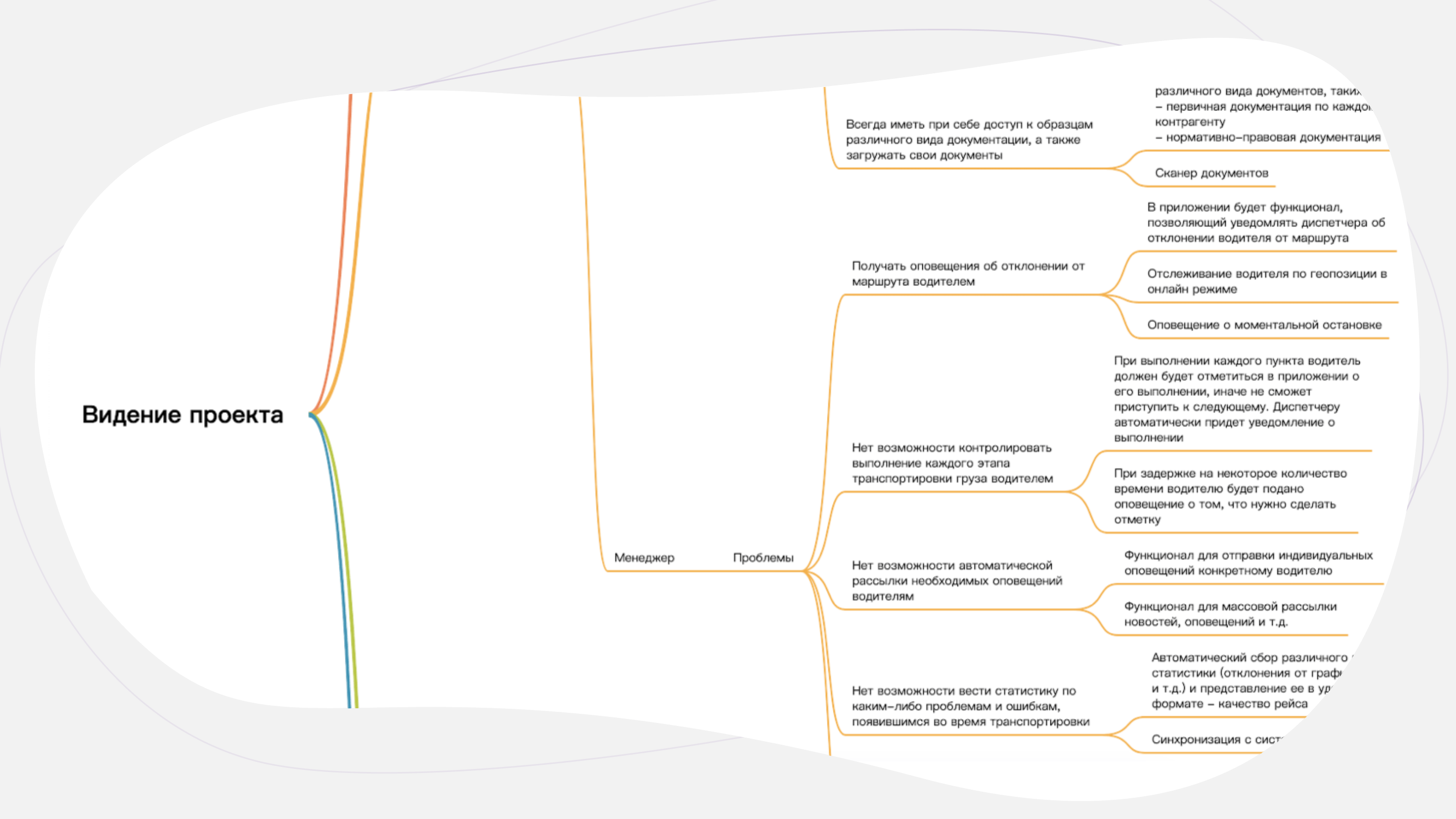 Видение проекта отвечает на ключевые вопросы — для кого и зачем создается продукт? В формате карты ума (mind map) описывается суть проекта, его цели, задачи и стейкхолдеры — лица, которые в этом заинтересованы. Обычно это заказчик и конечные пользователи. Для каждого из них определяются боли и предлагаются решения.