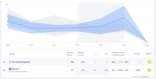 По окончании эксперимента вы получаете статистику по метрикам, важным для бизнеса: клики, просмотры, конверсии, глубина просмотра, отказ и другие параметры, выбранные вами при настройке. Это позволяет объективно оценить эффективность каждого варианта и принять решение на основе данных.