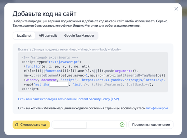 Для работы с Вариокубом необходимо установить на сайт код счетчика Яндекс.Метрики и обязательно код технологии Вариокуб.
