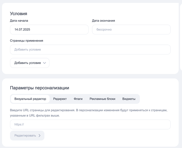 Редактирование также производится через визуальный интерфейс: можно изменять текст, структуру HTML, внешний вид через CSS. После этого вы выбираете сегмент аудитории, на который распространяется настройка. Например, только новые посетители, пользователи с определённого устройства или те, кто ранее выполнял целевое действие.