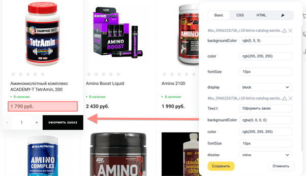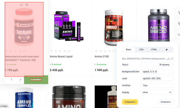 Вы можете выделить элемент, изменить его содержимое, внешний вид или поведение — и тут же сохранить новую версию для теста.