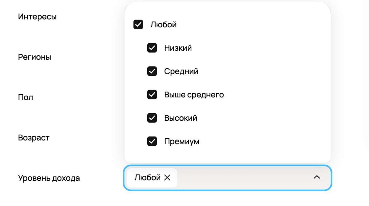 Главная фишка Авито — таргетинг по уровню дохода. Такой опции нет ни в Telegram Ads, ни в РСЯ. По сути, Авито заранее сегментирует пользователей по их платежному поведению внутри платформы. Мы можем сразу отсекать нецелевую аудиторию и, например, показывать рекламу только людям с высоким и премиальным доходом. Для ниш вроде авто, техники, финансов и образования это даёт очень сильный буст к качеству трафика.