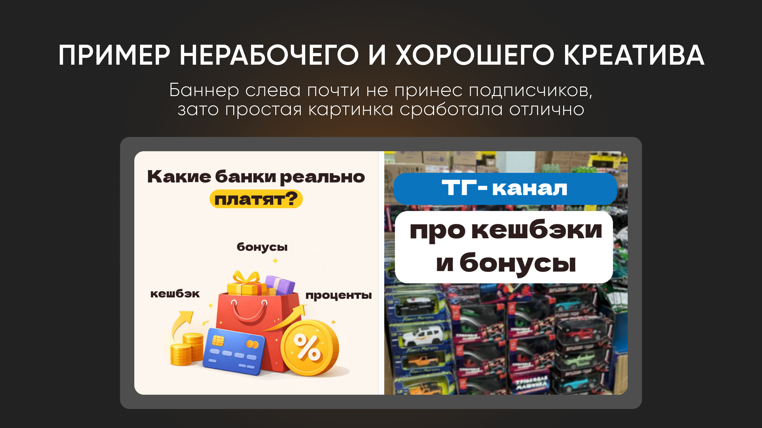 Простые фотографии работают лучше дизайнерских. Аудитория Авито привыкла к обычным фото товаров, поэтому простота побеждает. Лучшие креативы — стоковые фото без обработки. Один из топовых баннеров в проекте с банками — просто фотография кроссовка, без текста и кнопок. В заголовке «ТГ-канал с выгодными картами». Работает отлично.